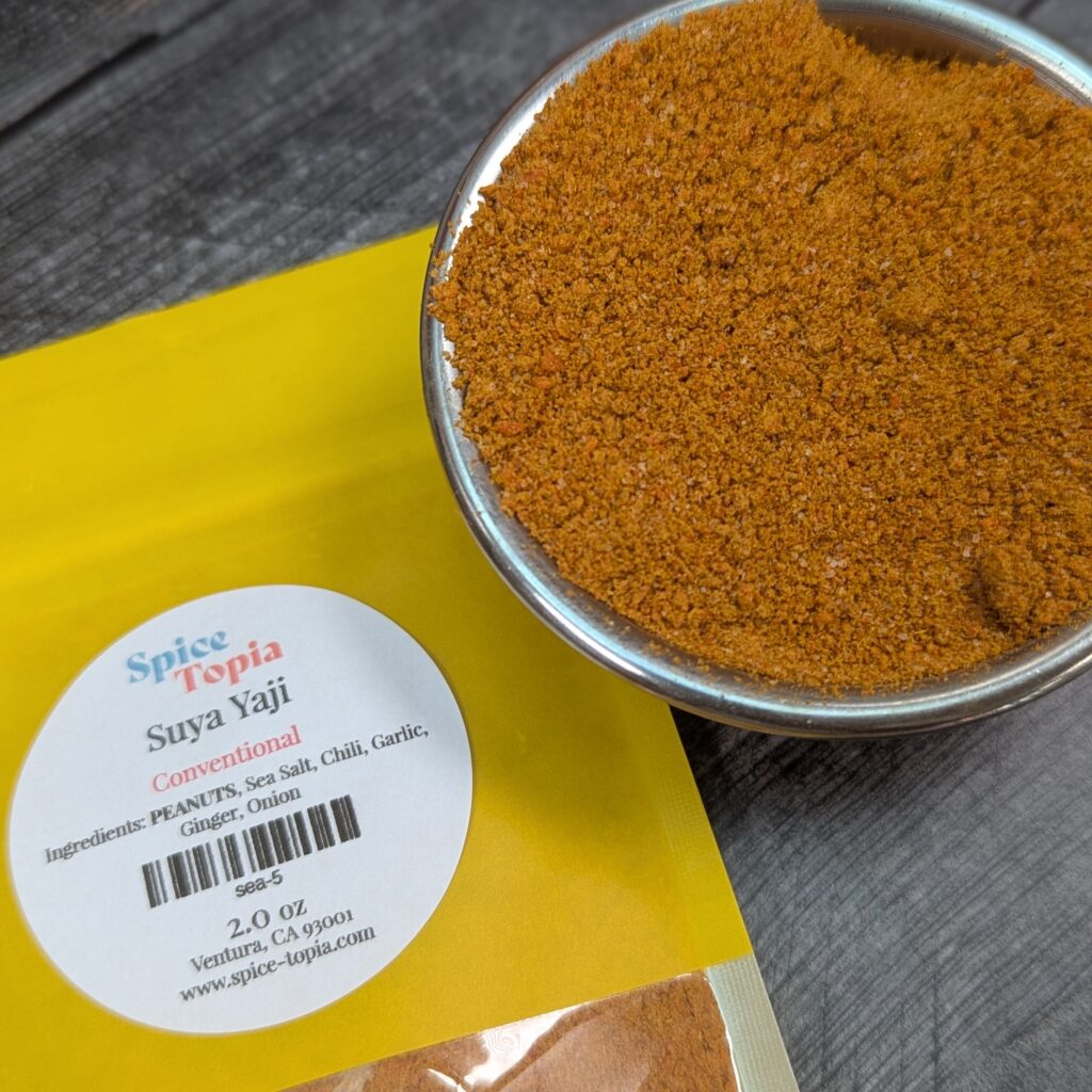 Suya yaji is a bold West African spice blend traditionally used to season suya, the famous Nigerian street food of skewered, grilled meat. The mix is built around roasted peanuts ground into a coarse powder, then layered with spices like ginger, garlic, cayenne, paprika, and sometimes onion powder. The result is a smoky, nutty, and fiery seasoning that clings beautifully to meat as it grills over open flames. While it’s most often rubbed onto thin slices of beef before cooking, suya yaji also works well sprinkled over chicken, vegetables, or roasted peanuts, bringing a warm heat and deep savory flavor that’s both earthy and addictive.